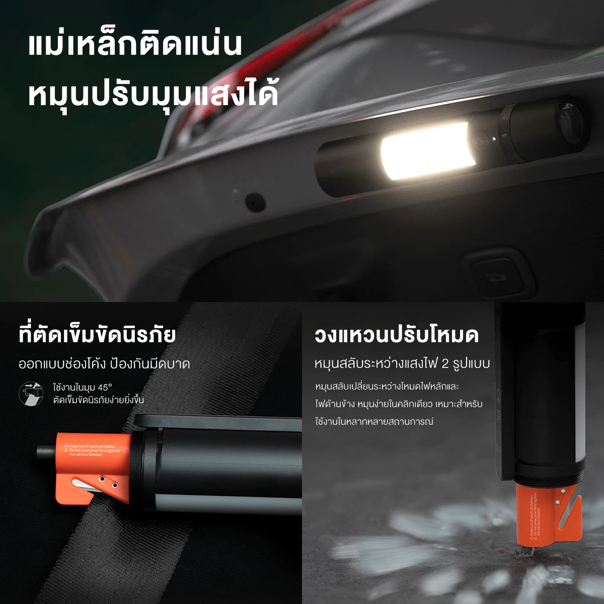 หมุนเพื่อสลับไปมาระหว่างโหมดไฟดวงหลักและโหมดไฟข้างได้อย่างง่ายดาย ปรับตำแหน่งด้วยปุ่มเดียวเพื่อให้ใช้งานได้หลากหลายสถานการณ์