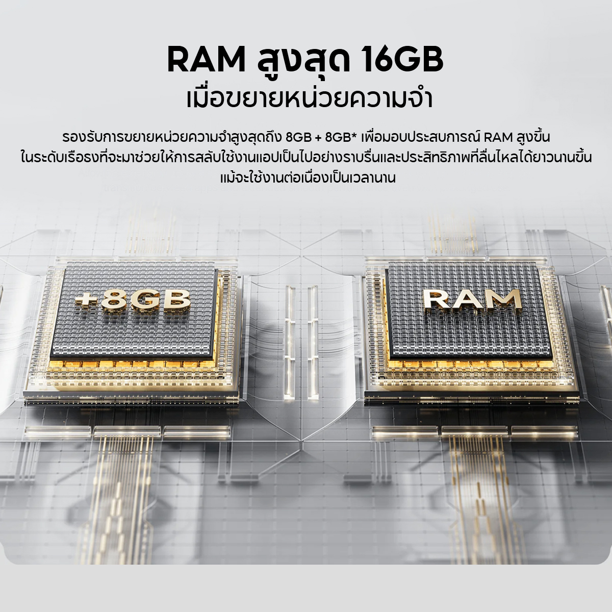 6GB + 128GB, 8GB + 256GBLPDDR4X + eMMC 5.1รองรับการขยายหน่วยความจํา: สูงสุด 16GB*การกําหนดค่าที่ใช้ได้อาจแตกต่างกันไปในแต่ละภูมิภาค RAM และที่เก็บข้อมูลที่มีอยู่น้อยกว่าหน่วยความจําทั้งหมดเนื่องจากการจัดเก็บระบบปฏิบัติการและซอฟต์แวร์ที่ติดตั้งไว้ล่วงหน้าบนอุปกรณ์*RAM 16GB พร้อมส่วนขยายหน่วยความจําขึ้นอยู่กับรุ่น RAM 8GB RAM เพิ่มเติมจะใช้พื้นที่เก็บข้อมูล ROM ในปริมาณที่สอดคล้องกัน การขยายหน่วยความจําจะใช้ได้เฉพาะเมื่อมีพื้นที่เก็บข้อมูลเพียงพอบนอุปกรณ์ของคุณ การขยายความจุ RAM ที่แท้จริงจะแตกต่างกันไปในแต่ละรุ่น