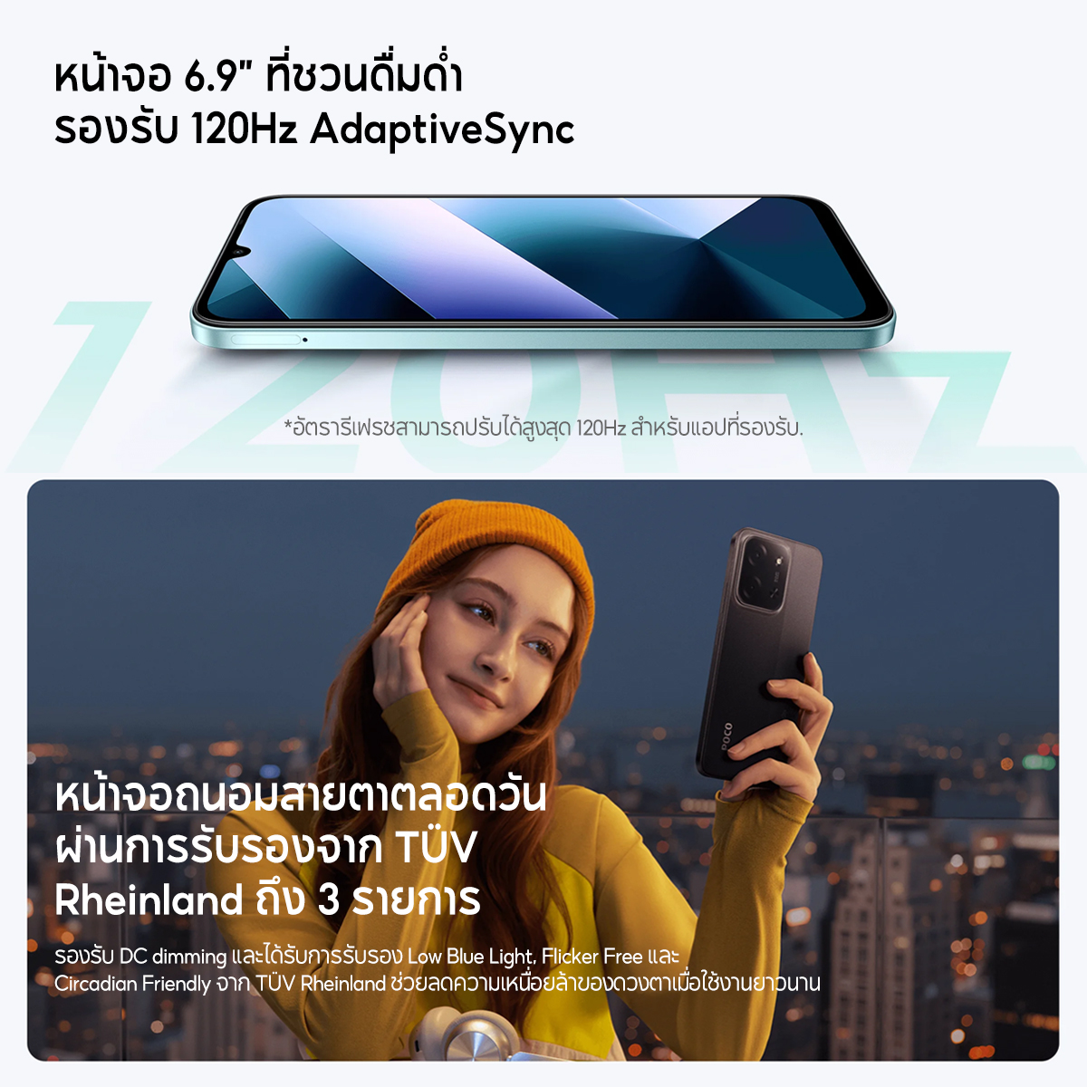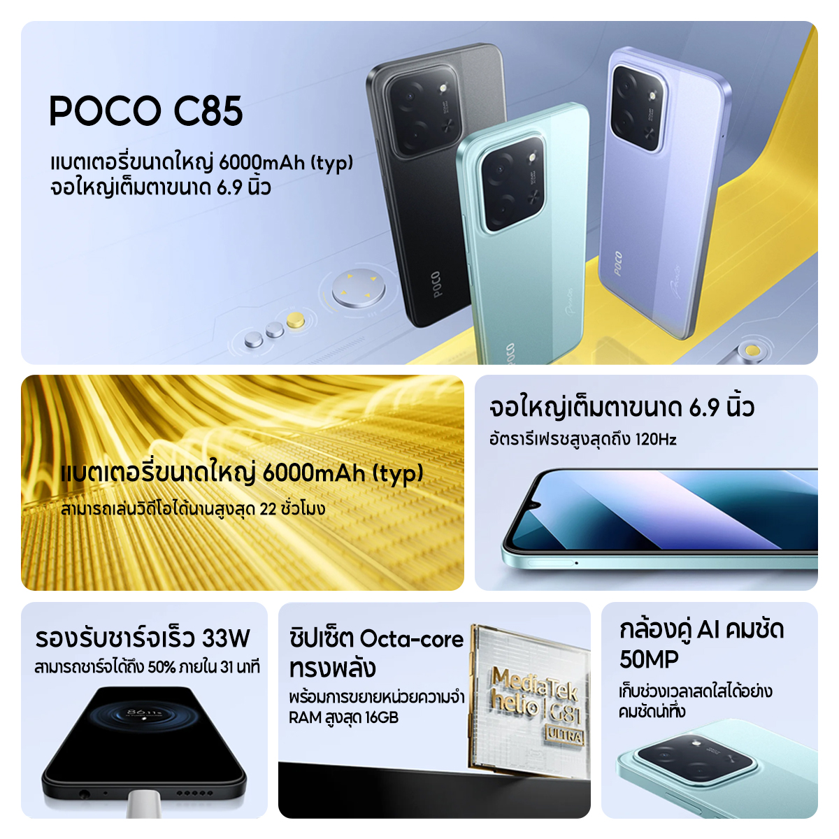 Xiaomi POCO C85 แบตเตอรี่ความจุสูง 6000mAh (typ) หน้าจอแสดงผลขนาด 6.9 นิ้ว กล้อง AI คู่ความละเอียด 50MP