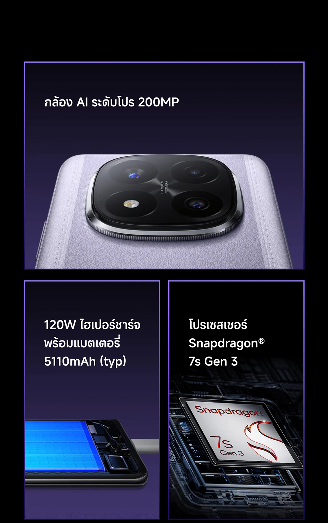 โปรเซสเซอร์ Snapdragon® 7s Gen 3กระบวนการผลิต 4nmCPU: โปรเซสเซอร์ Octa-Core สูงสุด 2.5GHzGPU: Adreno GPU